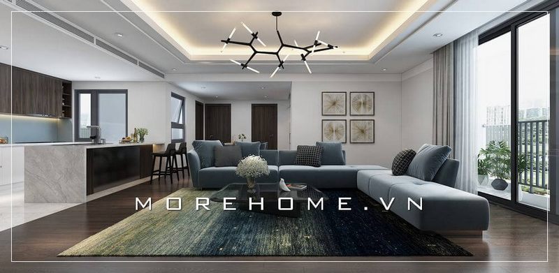 Sofa chữ L màu xanh sẽ làm nổi bật trong một mẫu thiết kế phòng khách chung cư tinh tế này.